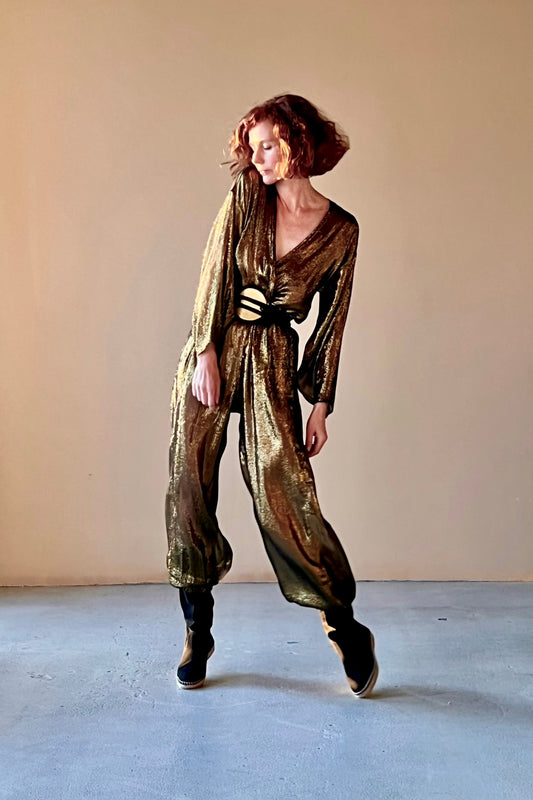 Kimono Jumpsuit Black & Gold Silk Chiffon Lame’