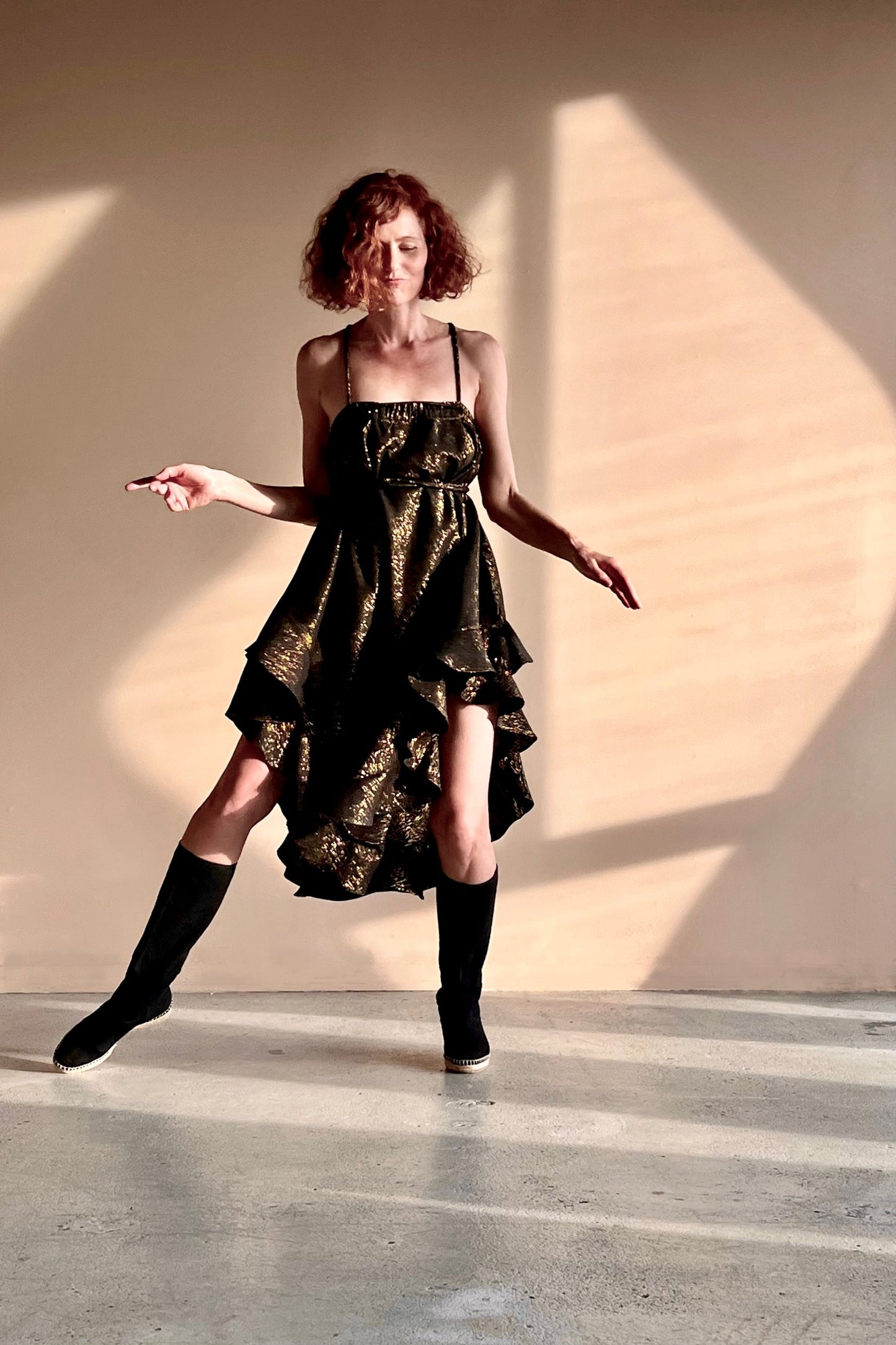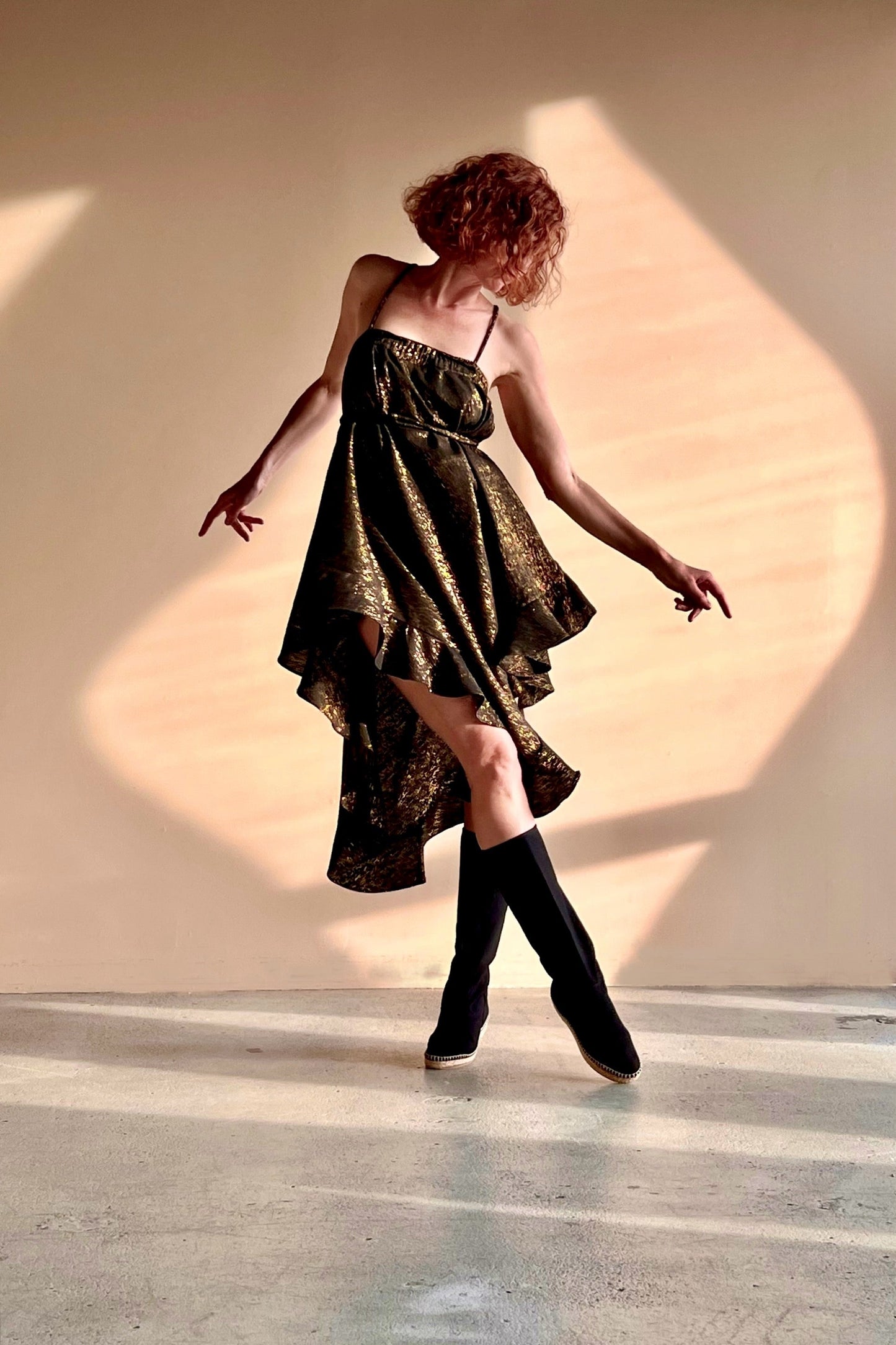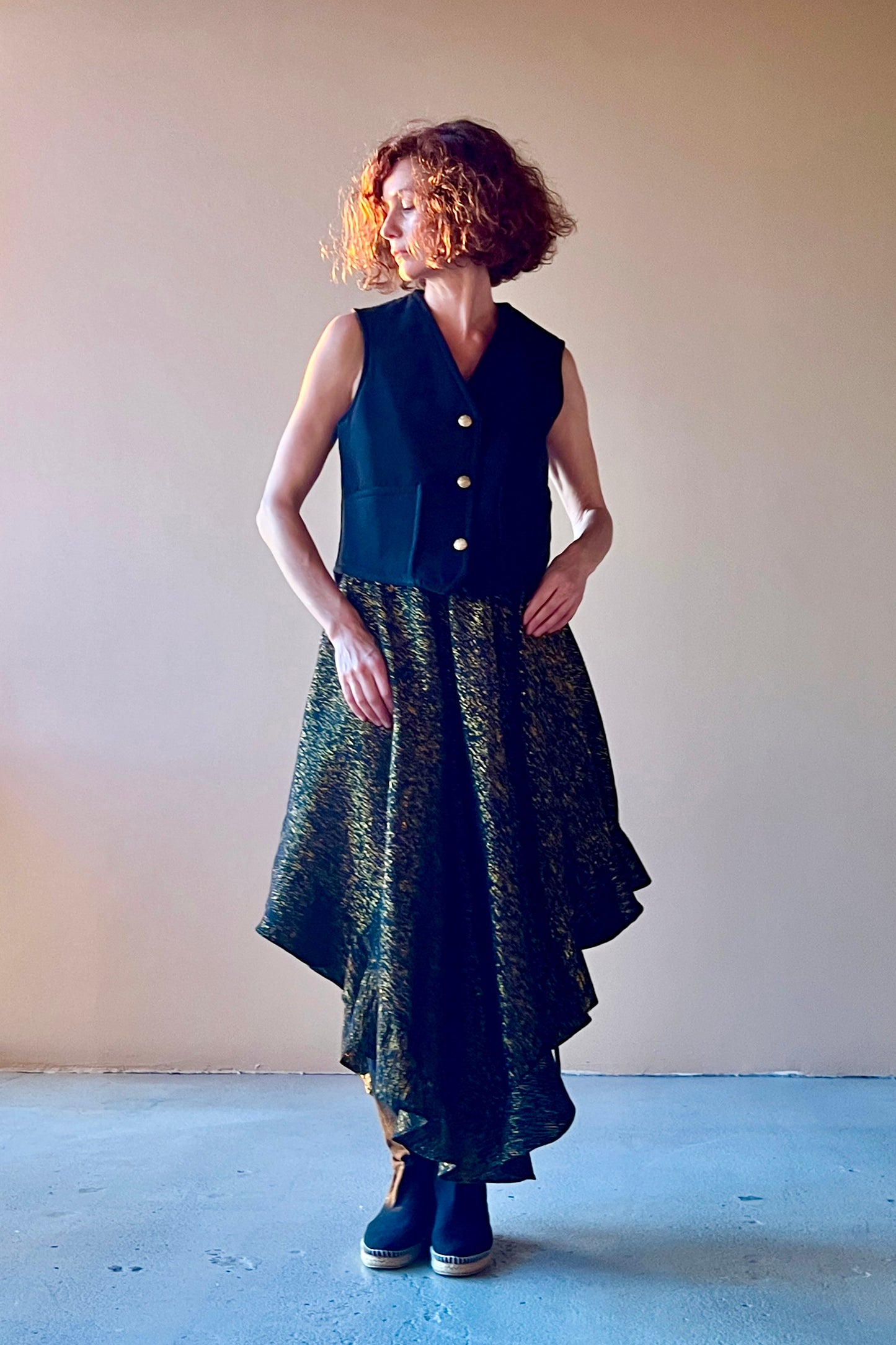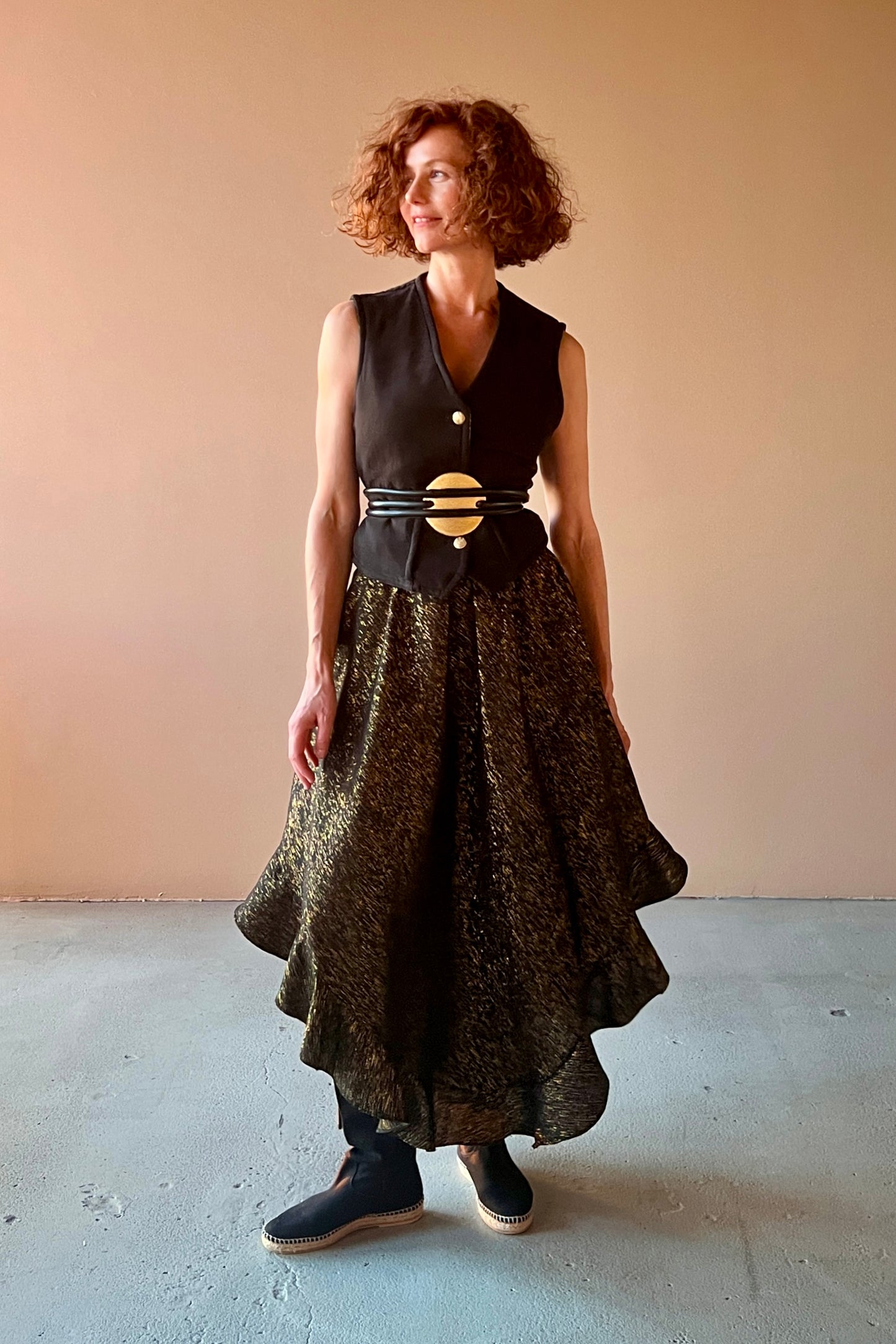 Cabriolet Ruffle Dress & Skirt in Black Onyx Metallic Gold Raw Silk