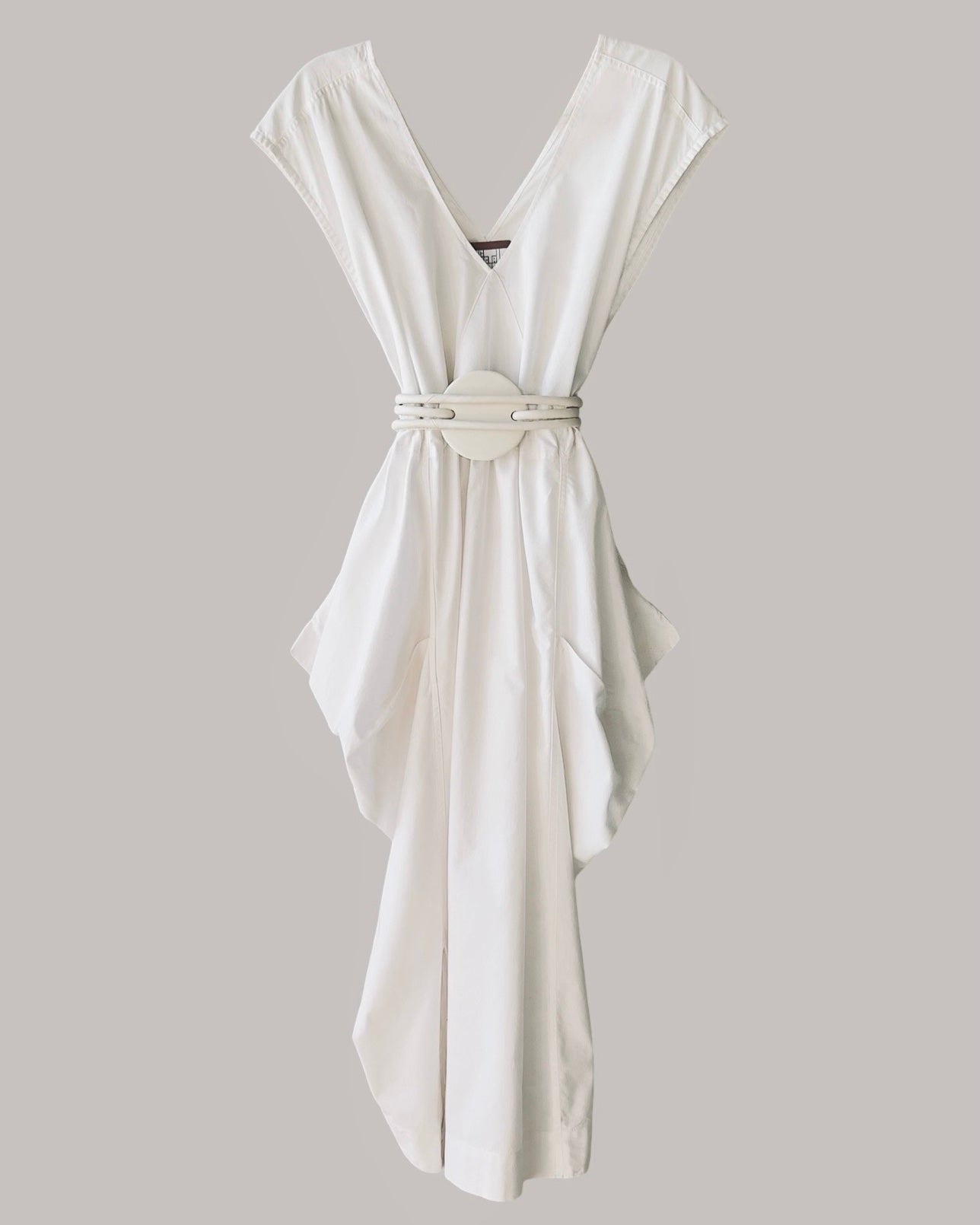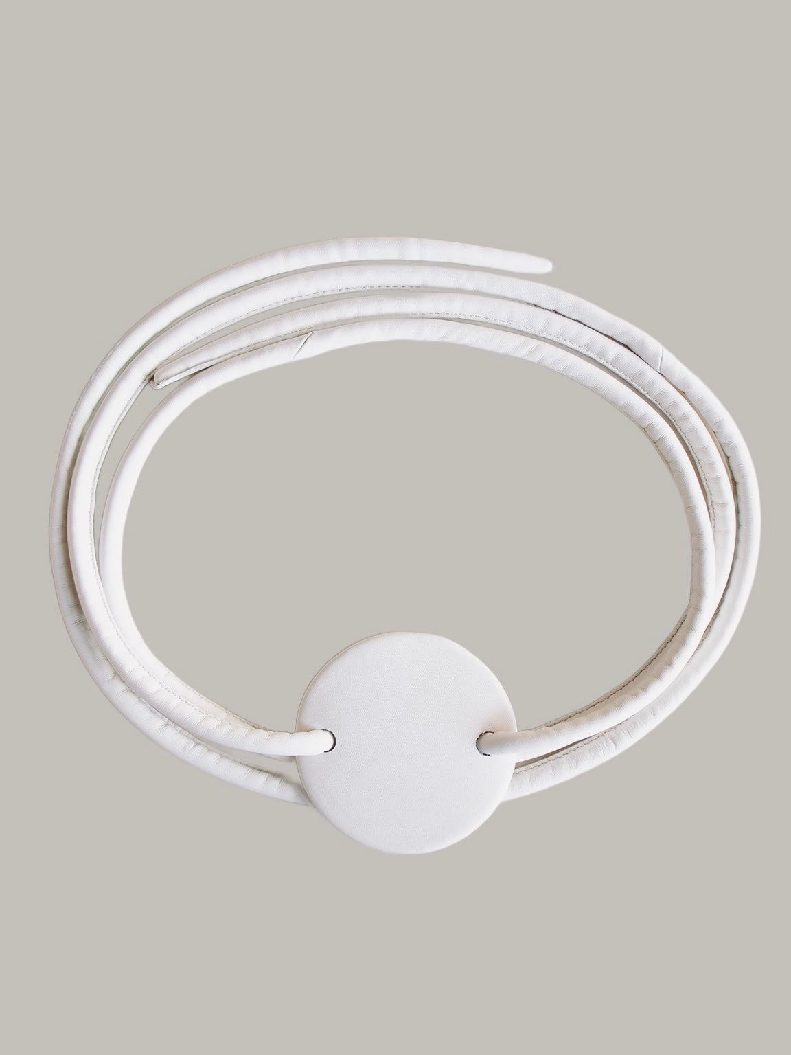 A sculptural belt made from soft, milk-colored leather with a smooth moon-shaped centerpiece. Infinite possibilities for knotting and tying.